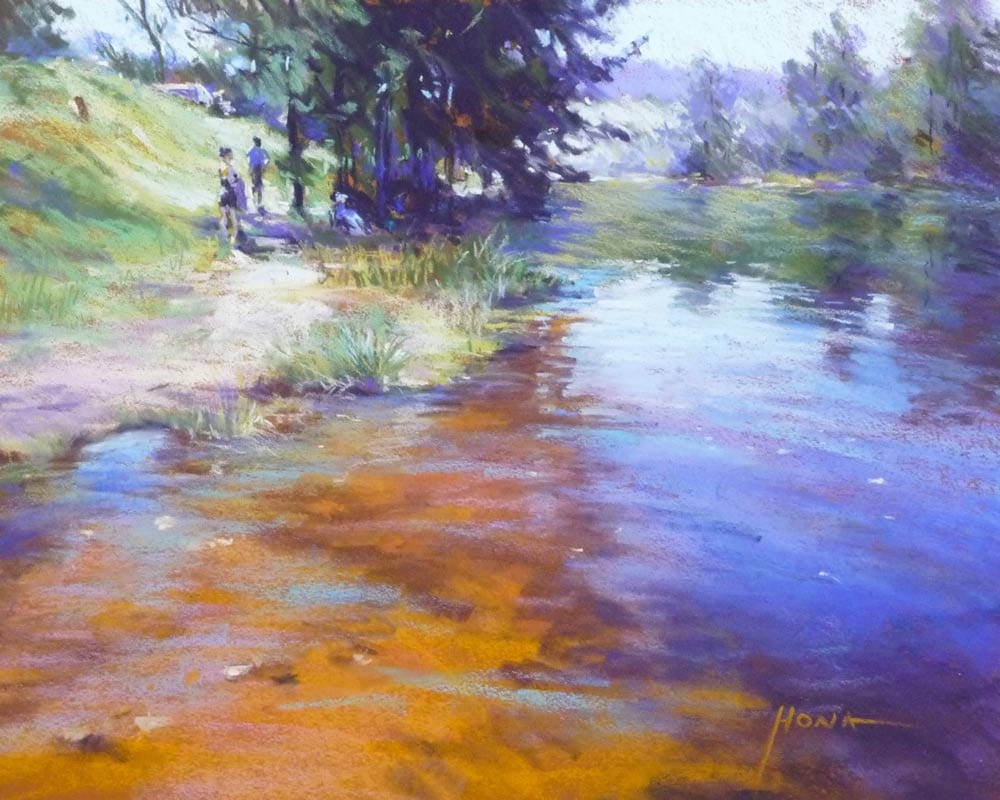 I was introduced to oil painting during the summer holidays when she was twelve but it wasn’t until February1980, not long after I was married, that I seriously began to study art through classical tonal oil painting over four years. Ten years later I switched to pastels, primarily because I had young kids and pastels is a medium that I could easily stop and start, needing only to quickly wash my hands if I had to suddenly stop. Since then, I’ve also taught myself acrylics, and watercolour in the form of pen & wash, as well as playing around with charcoal, but now I paint about equally in oils and pastels. Each medium has its benefits, but pastels easily affords an artist an ease for varied application, simple correction, speed of application, intense vibrant colours and are such a joy to manipulate and play with. Unison pastels are a standout in their quality, reliability and ease of use, and have been my go to brand for the last 30 years.