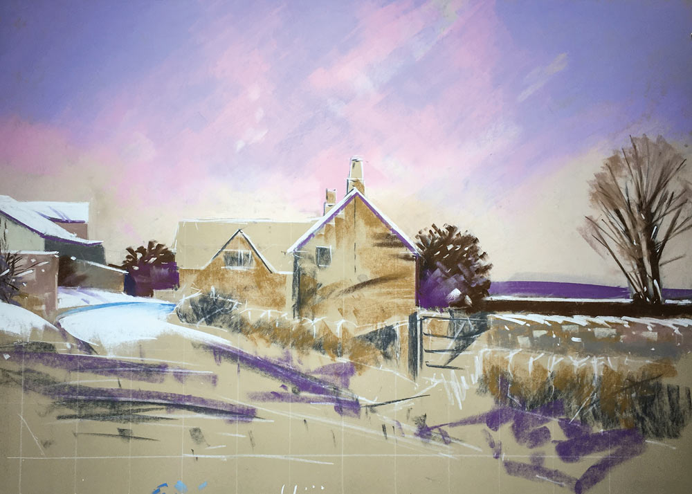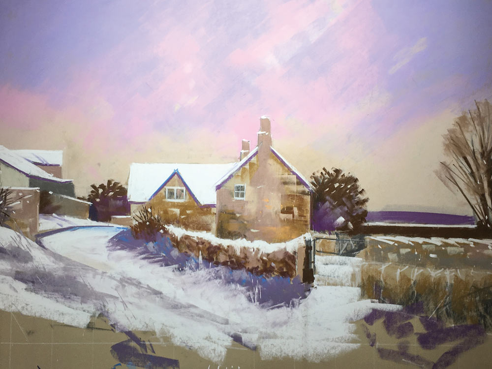 I now added texture to all the building surfaces including the garden wall in front of the building. I tried to indicate the nature of the stone without being too fussy with my mark making. I also included some of the snow at this stage in order to judge the texture and tone of the stonework. Although there were no strong shadows in the composition, I did use a cool purple on those parts of the snow that were not directly receiving light from the sky, particularly on the verge under the wall.