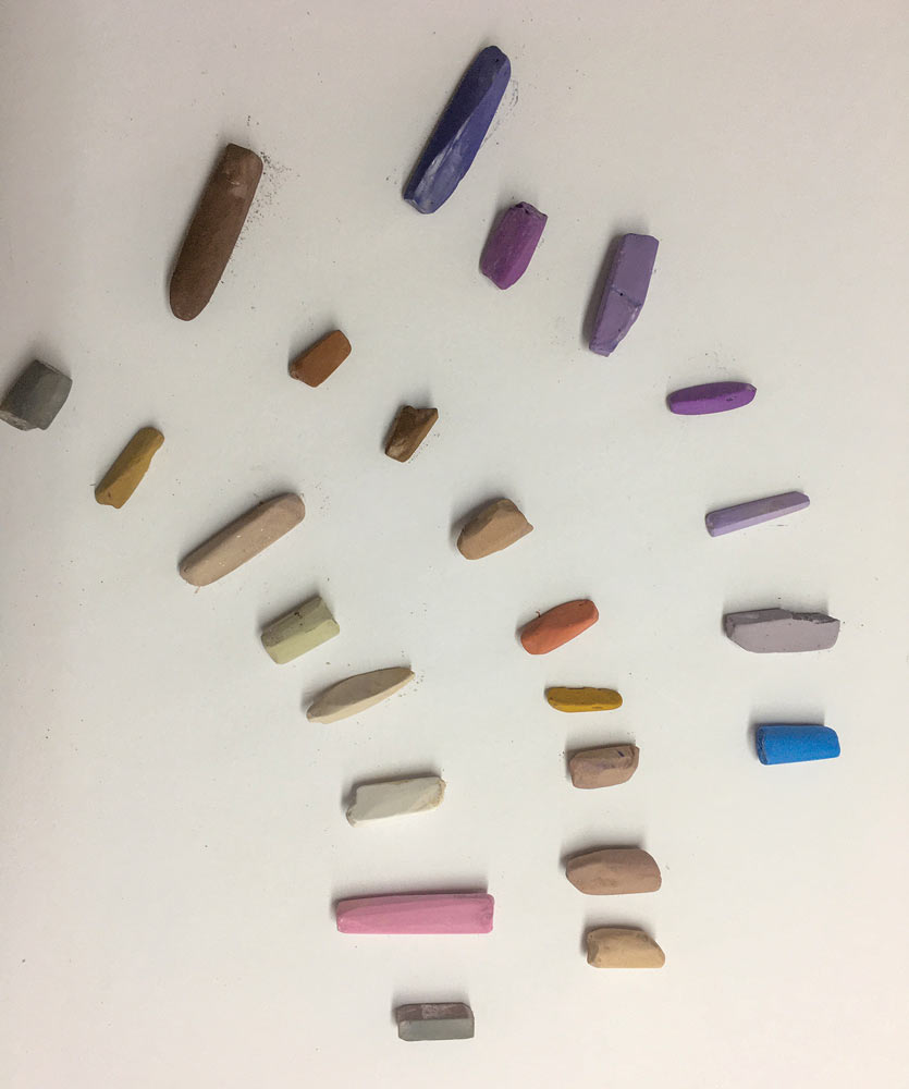 I am often asked what colours I use and, generally find this a difficult question to answer. Unison Colour produce such a wonderful array of hues that it is a bit like a ‘little boy in a sweet shop’. I do, however, consider an approximate overall scheme prior to starting a picture, hence the colour notes at the start of this publication. I thought it might be helpful to show the actual pastels used – there were just twenty-four and were selected from a range of purples and browns with pink in the sky and, of course, white.