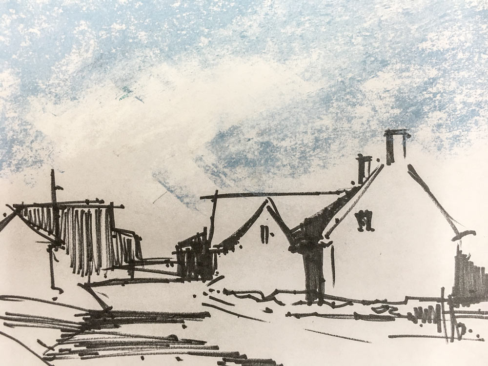 I continued to make preliminary dark marks on the buildings, walls and shadow areas in the snow.
