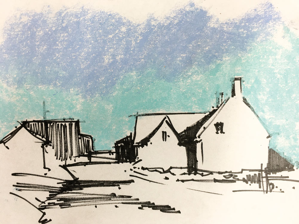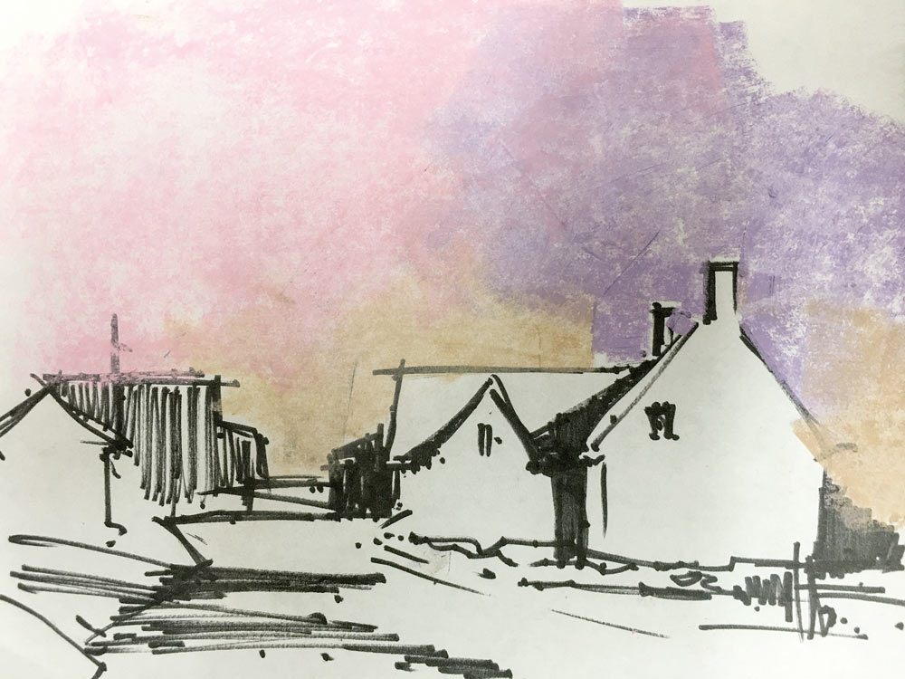 I therefore decided to change the weather conditions to snow and to explore an alternative treatment for the sky. With a black felt tipped pen, I quickly sketched the scene on a sheet of cartridge paper and printed off a few copies. I was then able to try out different pastel colour schemes for the sky as shown below: