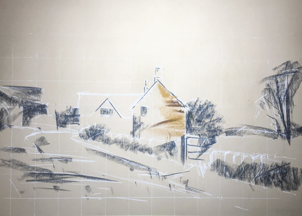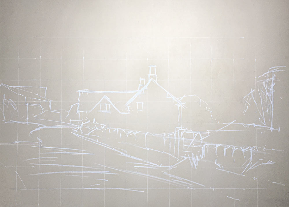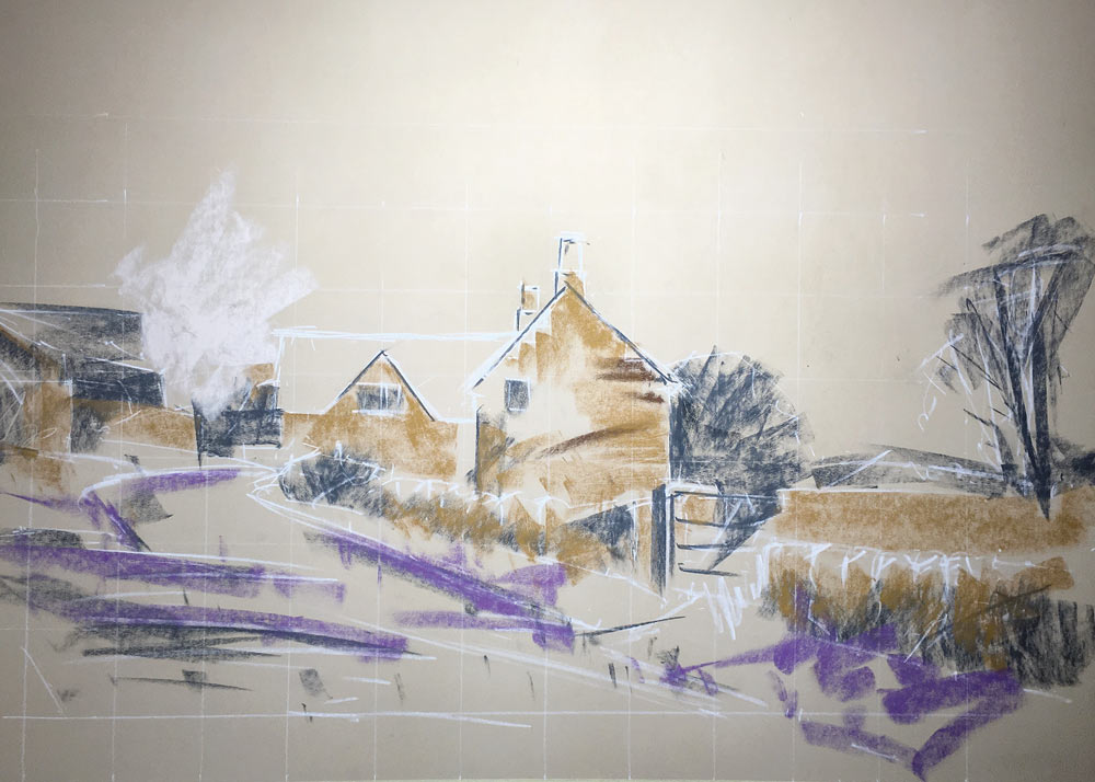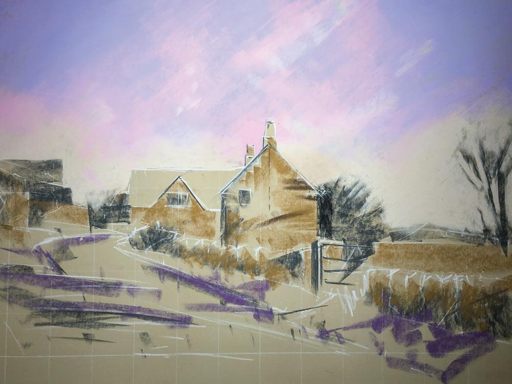 Using a sheet of cream Clairefontaine paper, I sketched the scene using a white pastel pencil. To help with accuracy, I squared up the photograph before transferring the image onto the pastel paper. With architectural subjects, I often do this as any drawing errors tend to stand out more with this type of subject.