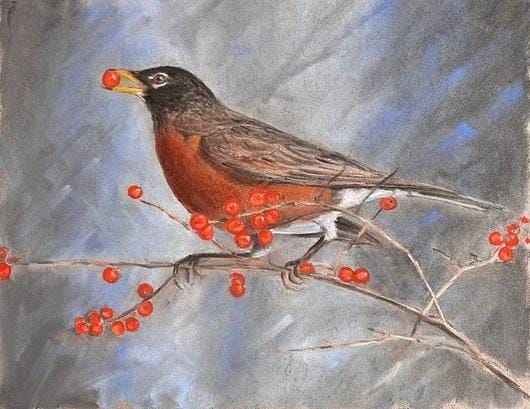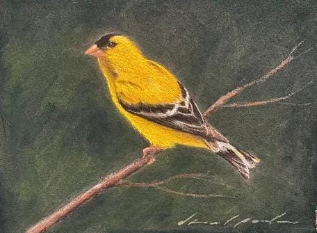 I only paint birds, farm animals and wildlife, but am especially drawn to the birds that visit my garden daily. As the weather warms, I can spend hours watching and listening to the goldfinches, house finches, scrub jays, song sparrows and so many more. Every now and then, I remind myself it’s time to weed – but, that always comes after painting!