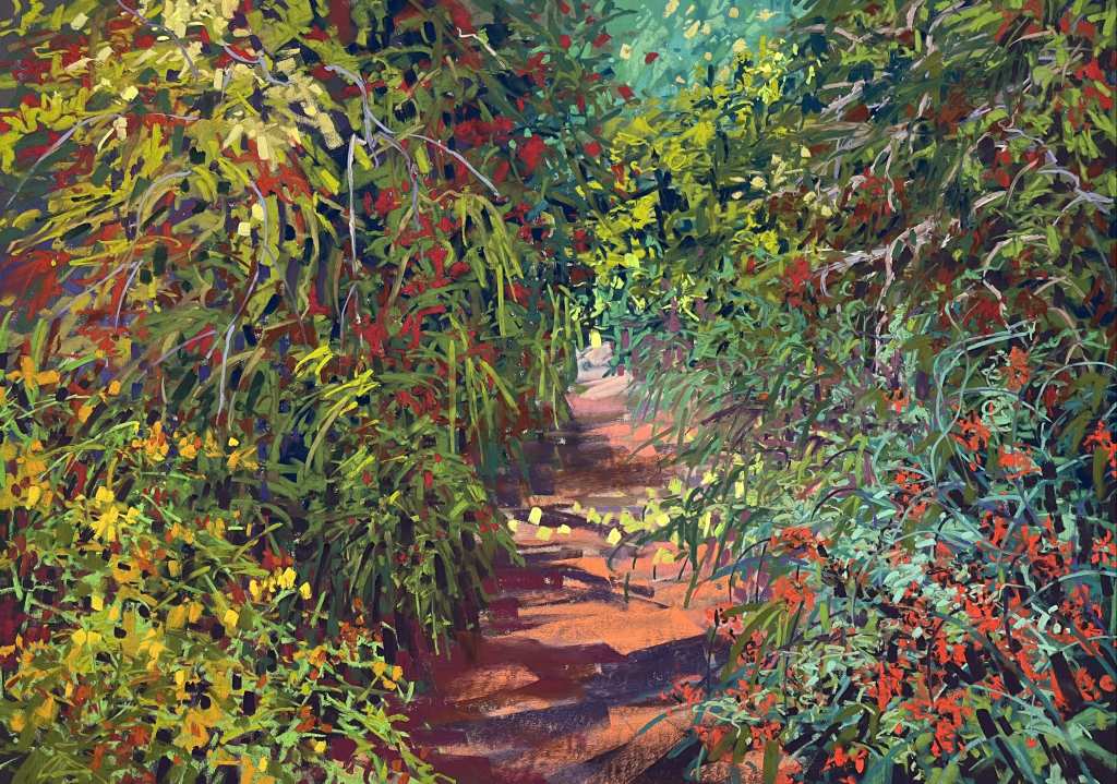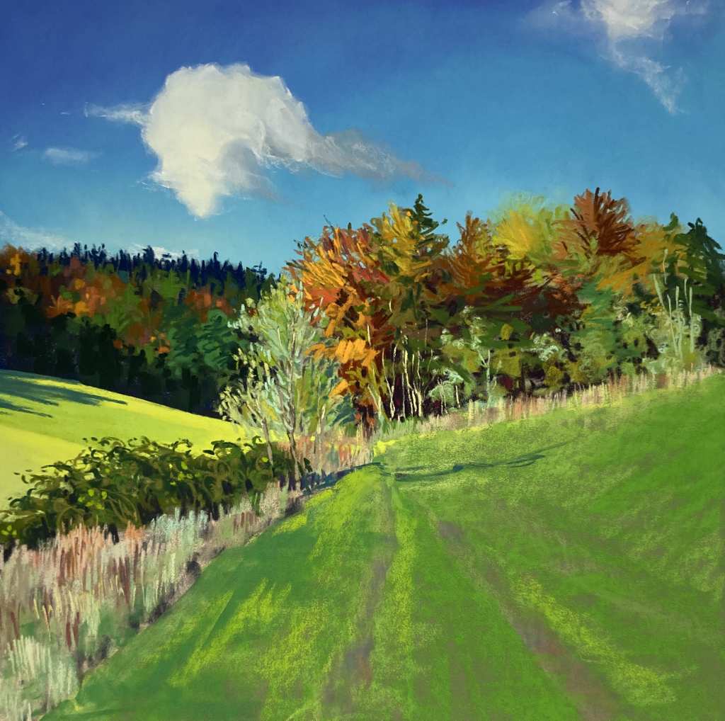This painting is the complete opposite of what I recommend to students in that it is absolutely filled with pastel marks and details with very little space for the eye to rest but I love it for it’s chaotic portrayal of such beautiful subject matter that I am witnessing in the local countryside right now. For me landscape painting is totally of the moment, it is what is happening out there right now… such a mindful occupation.