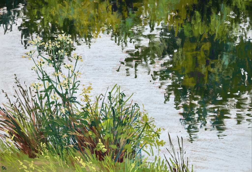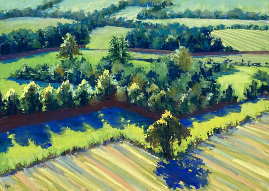 For our next “My 5 and me” blog, we are very lucky to have convinced our Associate Artist Cathy Pearce to give us an insight into her work. Cathy is a graduate of Central St Martins College of Arts and Design. She now practices her art in the leafy Wiltshire countryside alongside her potter husband, Nick. Her colour filled landscapes draw on her local influences, including the nearby flower filled chalk uplands and the quietly bubbling chalk streams that meander through the Wiltshire lowlands. Her work is characterised by beautiful mark making that sometimes verges on the semi abstract. She was recognised at the 2025 Pastel Society show, in the Mall Galleries, London where her piece, “Bright and Early” deservedly won the 2025 Artist Magazine Award. She also regularly runs workshops and has been featured on the Sky Arts Landscape Painter of the Year. Over to Cathy…