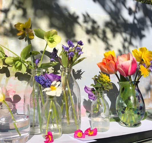 I loved these flowers in bottles glistening in this gorgeous ‘end of day light’, on a potting bench I had built and was about to move. It was just by a tree, in the garden and the light was coming through the leaves and created a wonderful dance of shadows, that of course was only fleeting, but that will be a delight to paint in the winter as a memory of brighter months. Most of these flowers would also not have lasted long enough for me to paint them, as, as soon as they are picked they tend to flop.