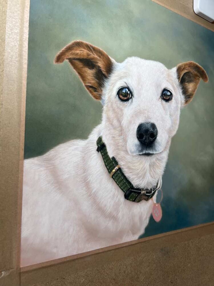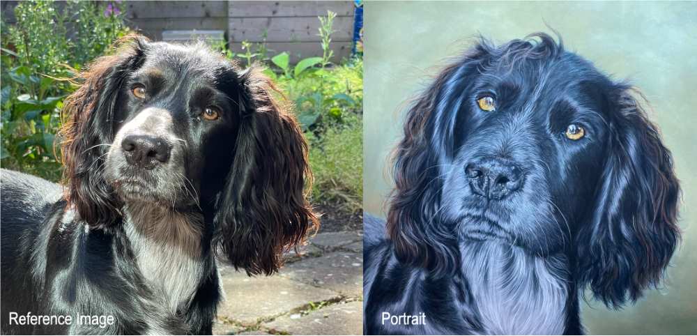 The eyes are my favourite part of any portrait and I’m always hoping to create an emotional connection with my viewer. I had a bonus with the reference photo as the owners had been caught in the reflection in her eyes, so it magically became a family portrait.