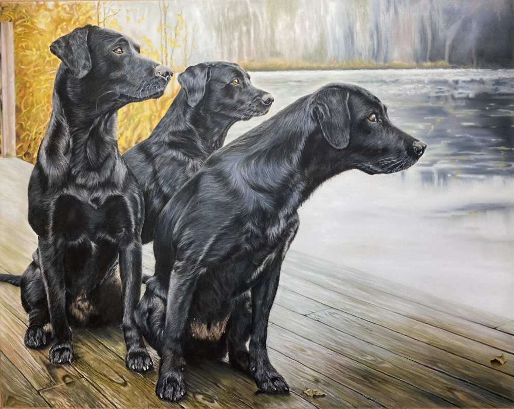 Having a black Labrador of our own meant I had a ready-made subject to study. My initial portrait of him shows my tentative attempts using pan pastels with pastel pencils (I’m also wondering why I chose this reference image as the perspective looks odd). The next triple portrait of three Labradors (called High Alert) shows the difference when I was using Unison Colour soft pastels for the under layers and background, and then adding the details with a mix of pastel pencils. Of course, there is also an element of being braver and feeling more confident in my style. In particular, not shying away from the dark shadows which act as a counterpoint to the highlights and really help bring the piece to life.