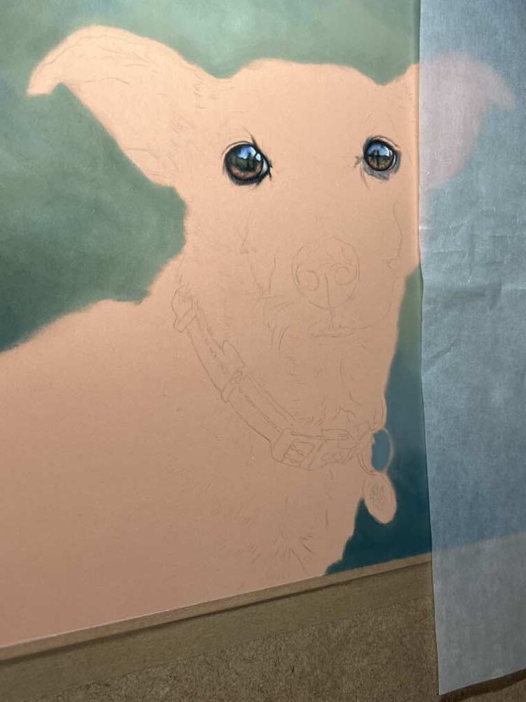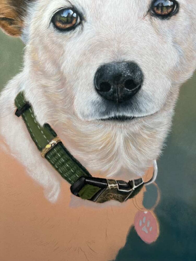 Sometimes I get distracted, and you can see I’ve jumped ahead to Mabel’s collar. I love how you can achieve so many different textures in pastels, from fabric, metal and plastic and that all important wet nose !
