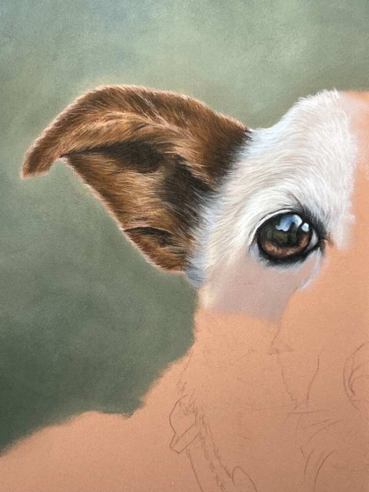 After working out the composition and doing the initial sketch, I start with the background working with my soft pastel sticks to create a boken background. I usually introduce a little bit of extra colour in the background that I pick out from the animal’s eyes – helping create a cohesive feel to the piece. In this case although the agreed background was to be a mix of greens, I used a little blue/grey which I could see in the reflections in her eyes and used this at the bottom of the portrait.