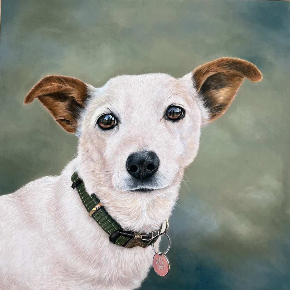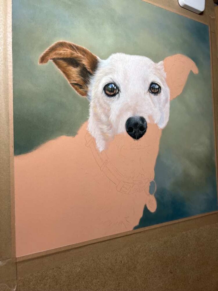I was commissioned to create a portrait of Mabel (40 x 40cm on Pastelmat), and this is a good example of my approach. She is a lovely dog who was rescued by her current owners with her sister. Unfortunately, her sister passed away not long after being rescued and Mabel is now on her own. However, this means she is now the centre of attention and gets all the treats to herself. She’s a timid little thing who loves nothing more than a good cuddle once she feels safe with you.