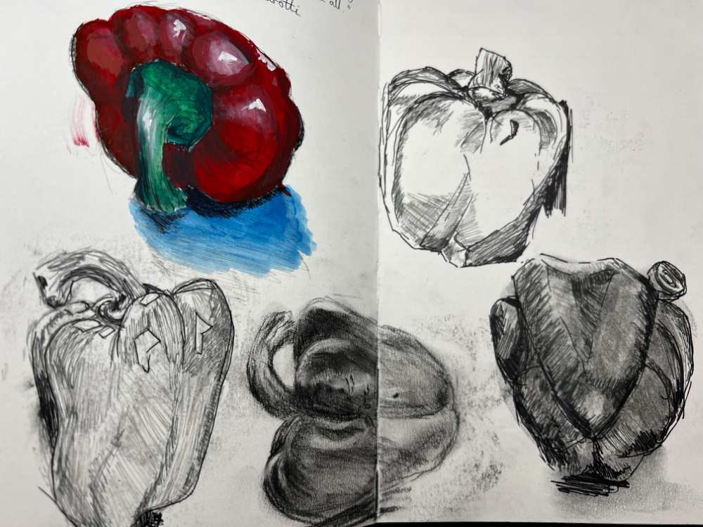 This desire led me to explore new mediums and establish a consistent art practice, which is crucial for growth. I developed a daily sketchbook habit which I used not only for observation but also to discover what draws me to certain subjects/compositions. Using a sketchbook daily enabled me to get rid of perfectionism and embrace experimentation! Drawing the same subject multiple times is a great way to help with observation – keep it easy and grab something from the kitchen. I love the shape and colour of this pepper.