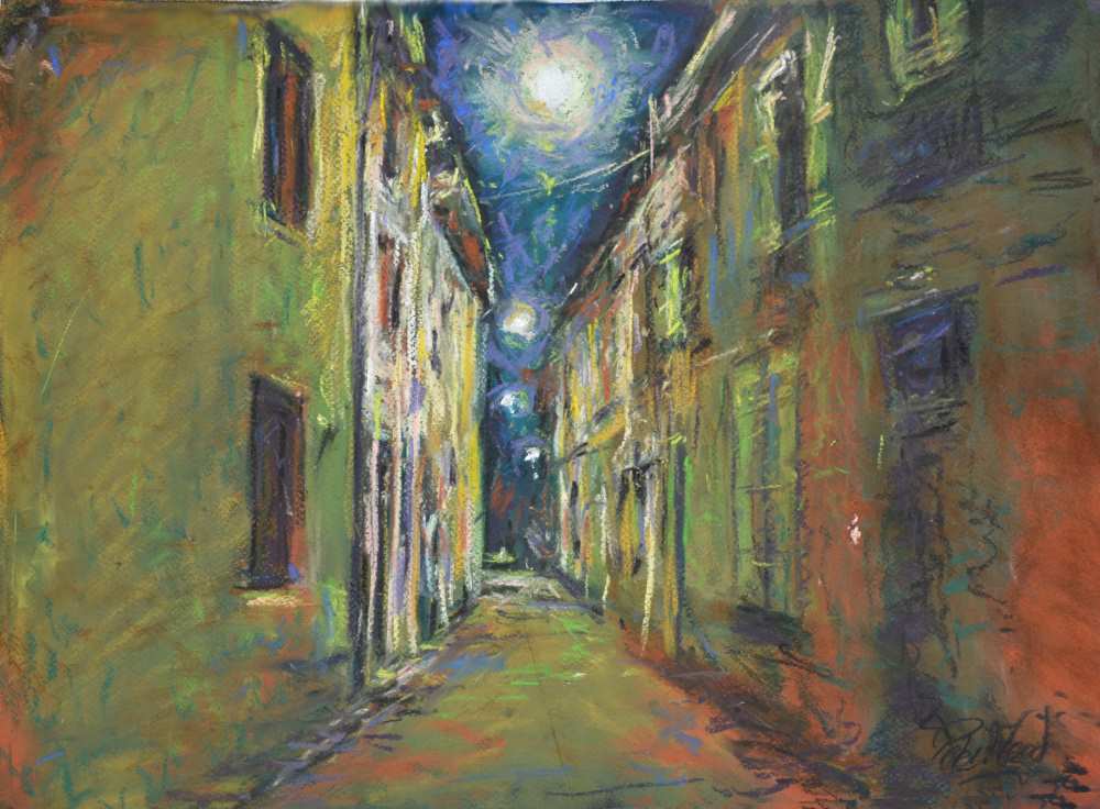 My next pastel in this article was, in fact, done just after the trip from a photo taken at night as we returned from a concert in Le Dorat. The light reflected down the narrow French streets reminding me of Van Goghs work! The whole process can be seen in detail on Night street Le Dorat…