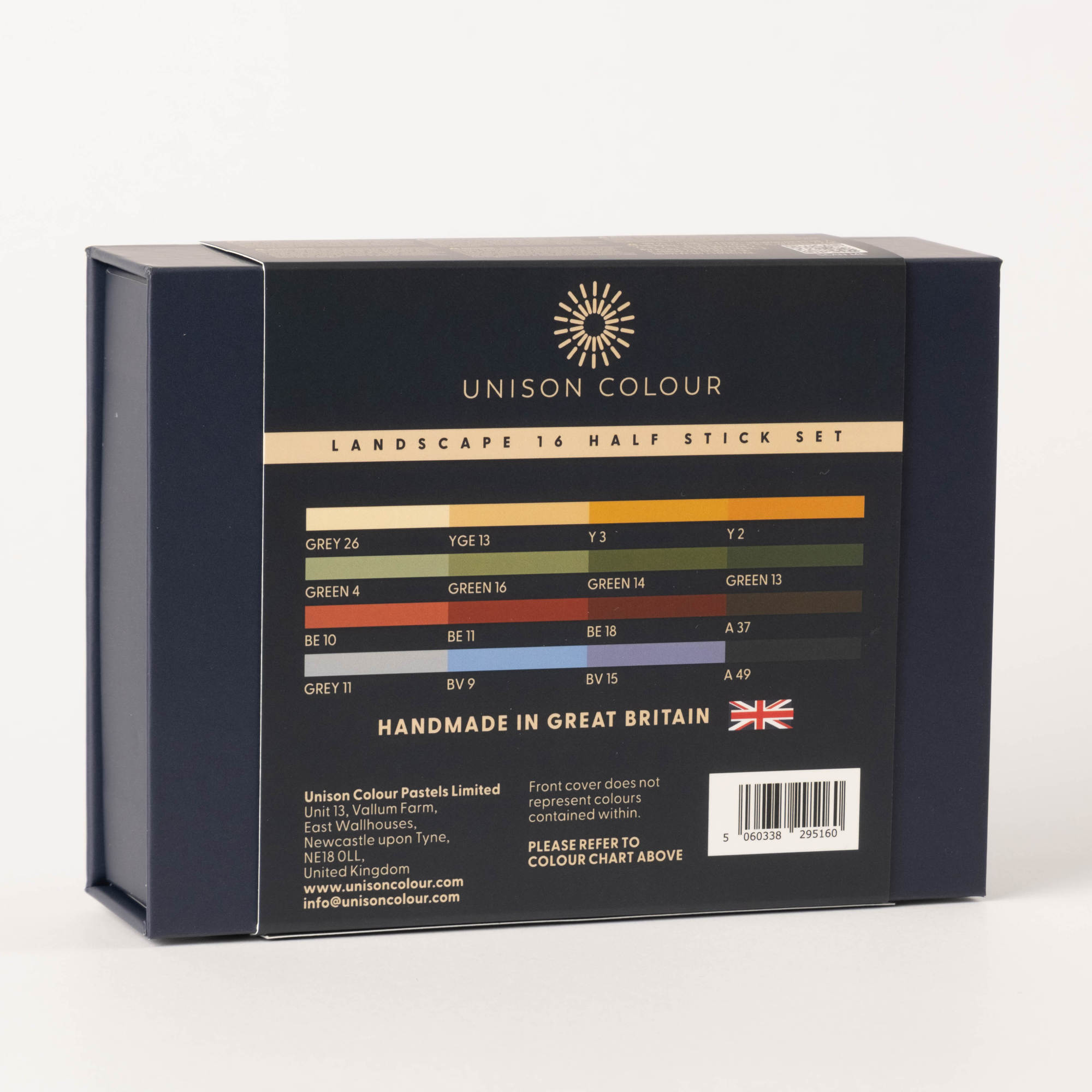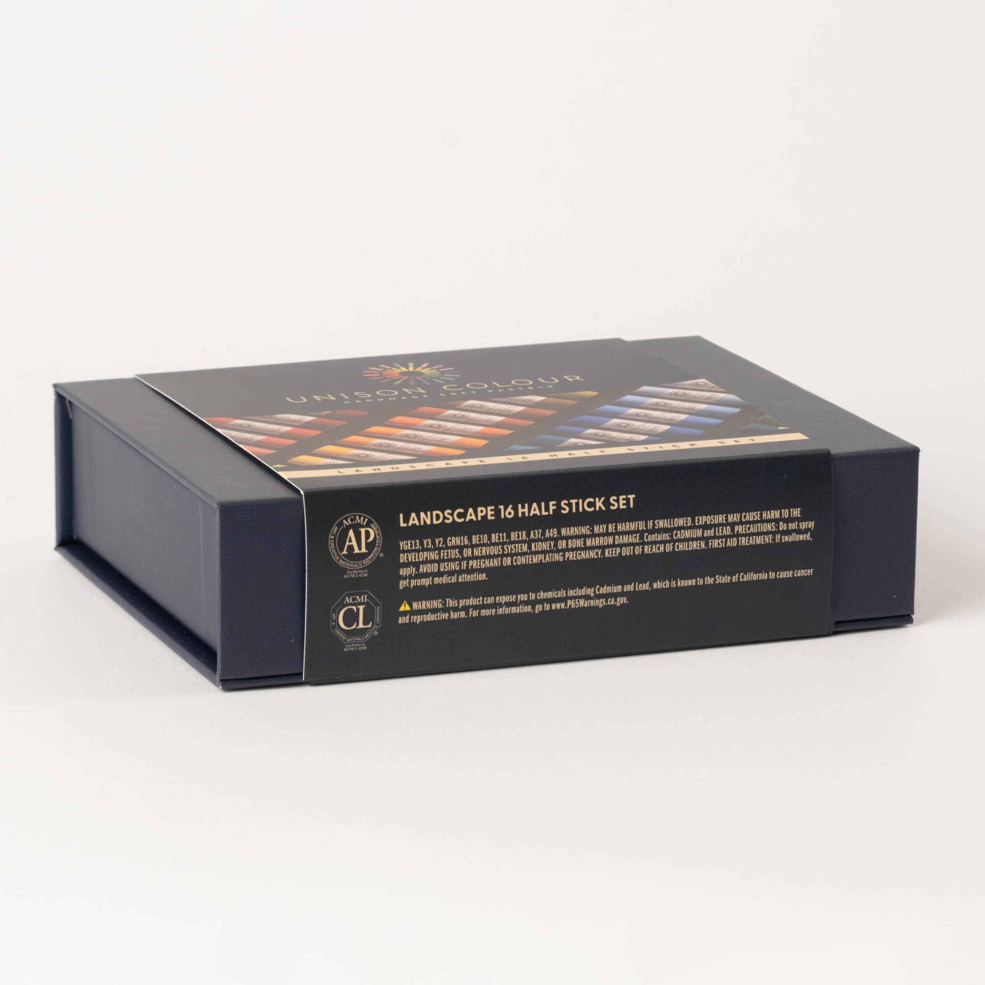 Our Landscape Half stick 16 set, specially selected by Unison Colour. This smaller set is perfect for those who are beginning their pastel journey or even as an addition to a full set. Unison Colour Soft pastels allow for ease of use with a highly blendable texture.  Our soft pastels have a smooth buttery texture and are water soluble.  These intensely pigmented pastels have superior lightfastness. These are high quality artists’ pastels that are handmade in the UK using traditional pigments. They are presented in our attractive and practical dark blue box.